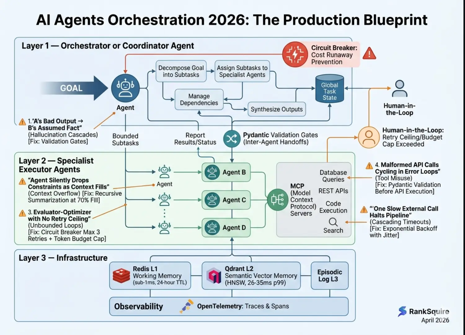 For the complete memory architecture that Layer 3 requires — see Agent Memory vs RAG: What Breaks at Scale 2026 at ranksquire.com/2026/agent-memory-vs-rag-what-breaks-at-scale-2026/