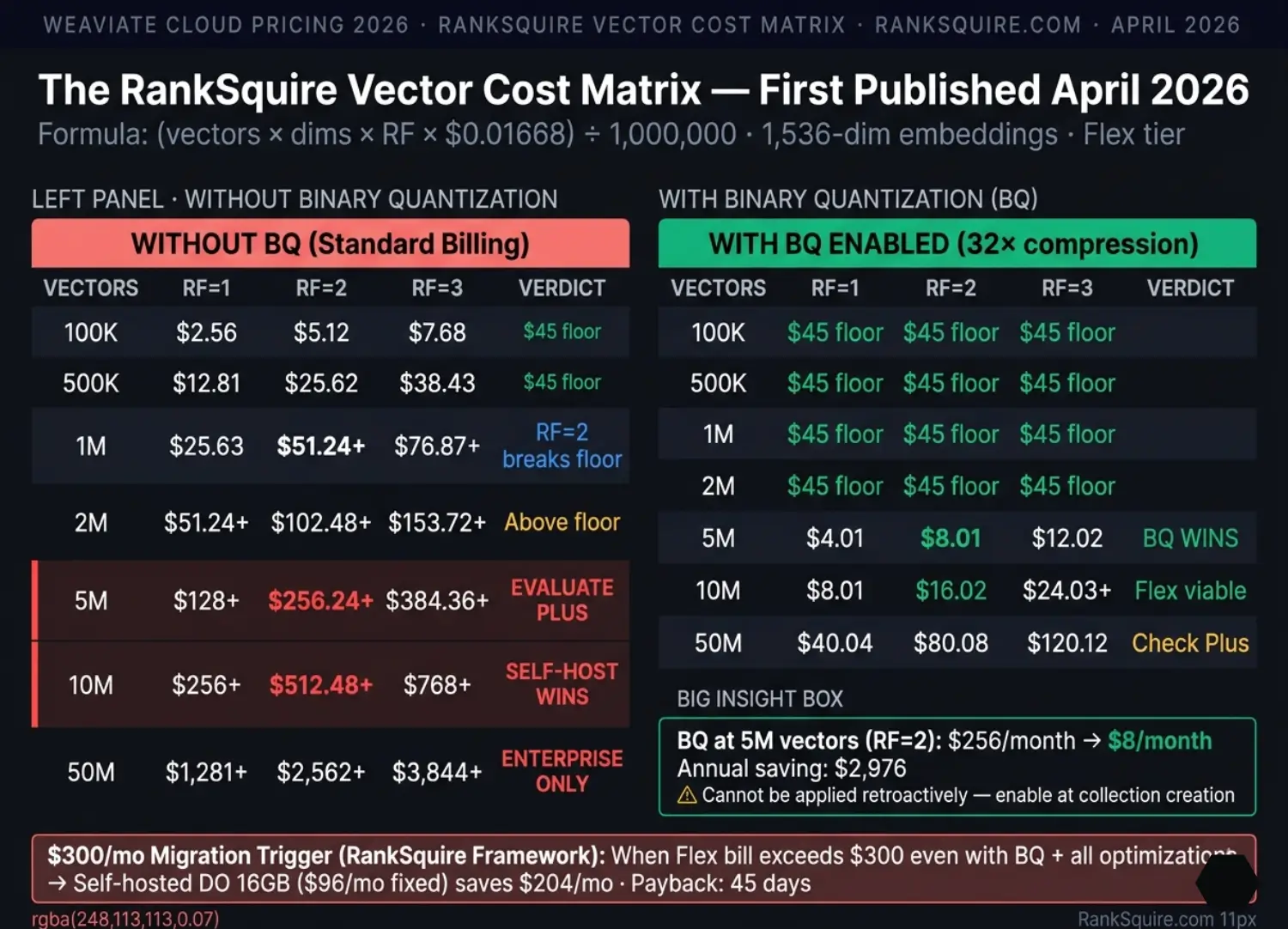 - The RankSquire Vector Cost Matrix — the first published table showing Weaviate monthly costs at 1M to 50M vectors across replication factors